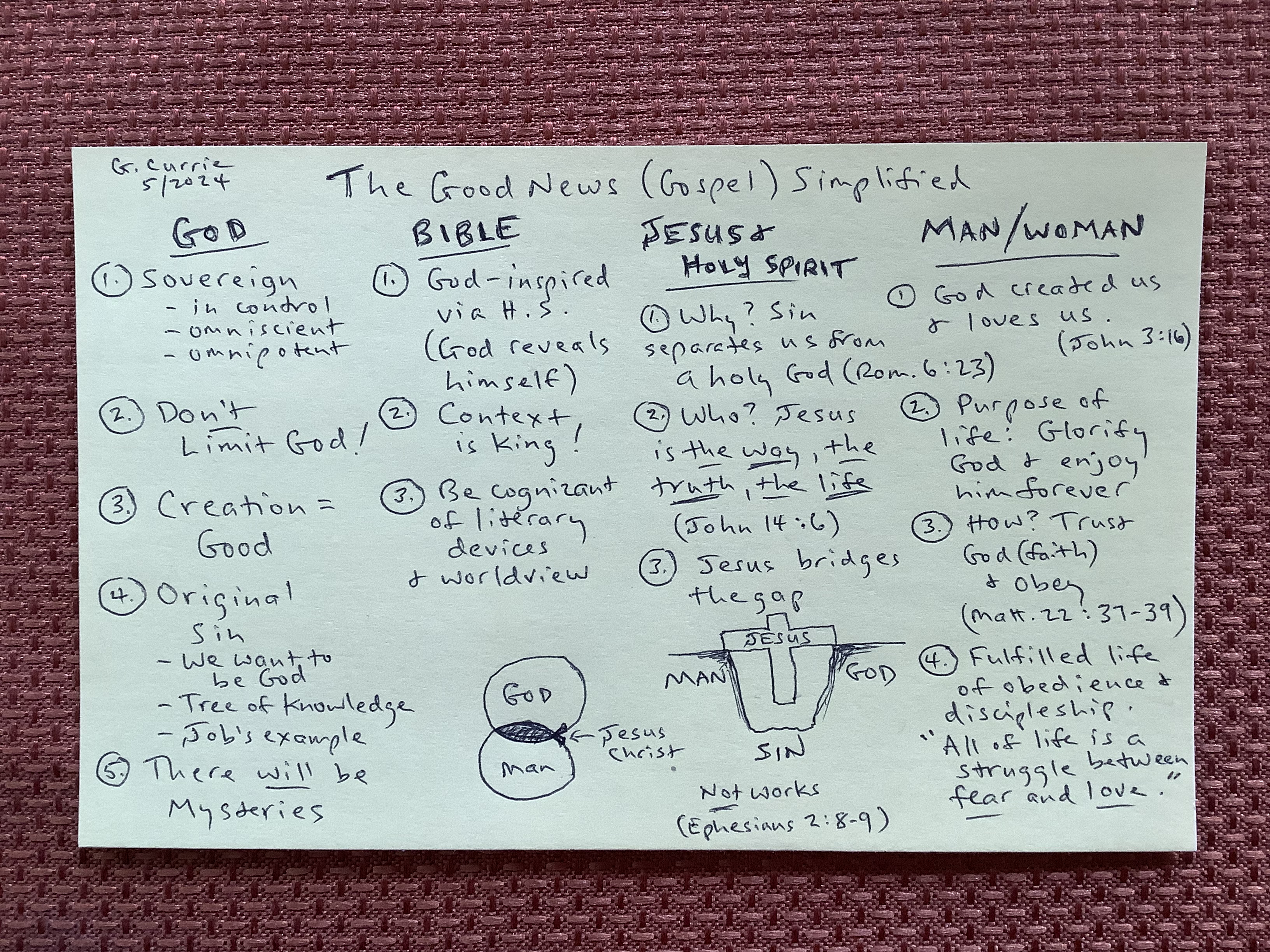 The gospel (good news) simplified Posted on May 6, 2024 by George H. Currie Share this: Share on X (Opens in new window) X Share on Facebook (Opens in new window) Facebook Like Loading... Related